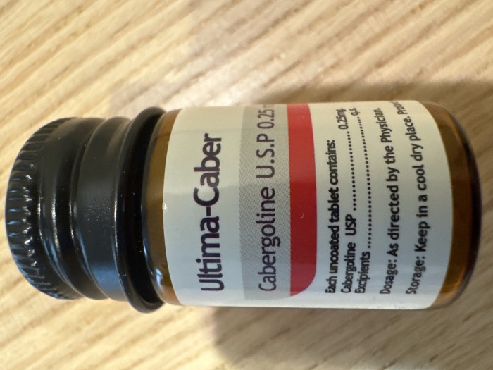 Great results with lowering prolactin levels with Ultima Pharmaceuticals Caber 10 pills x 0.25mg each. Also good for libido and keeping hormones right. Took .25mg a week, very effective.