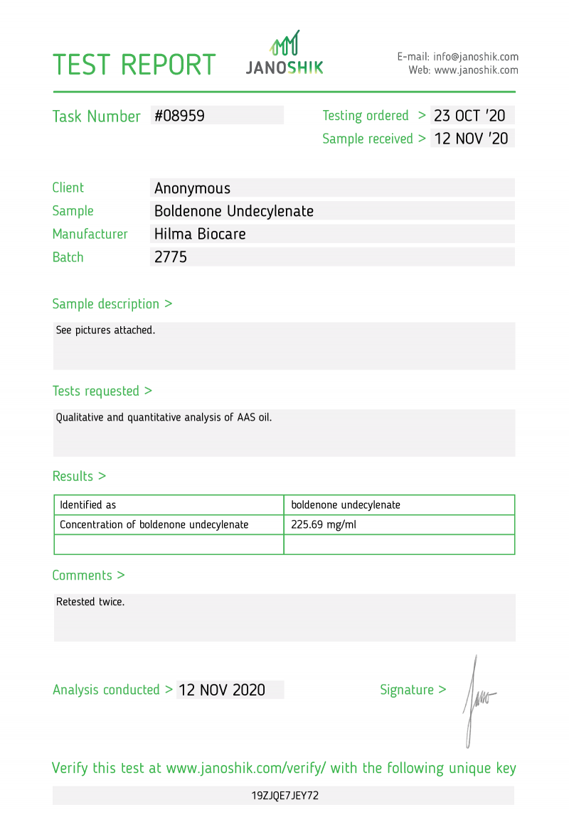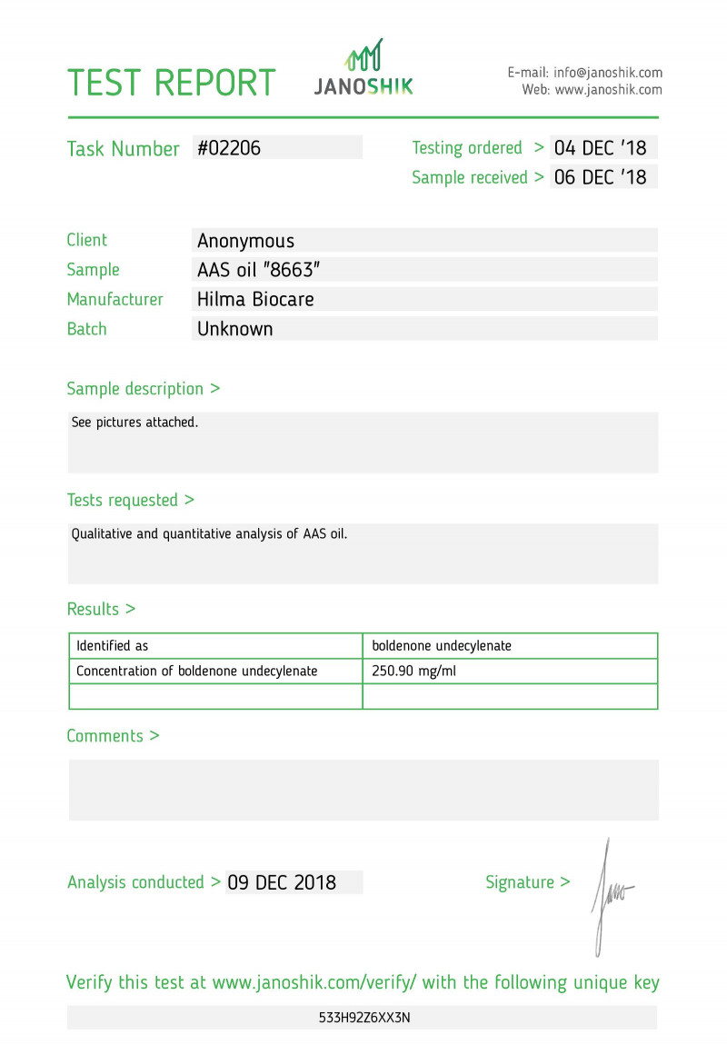 Actual contents: Hilma Biocare Boldenone Undecylenate was determined to have an actual content of 250.90 mg/ml boldenone undecylenate.