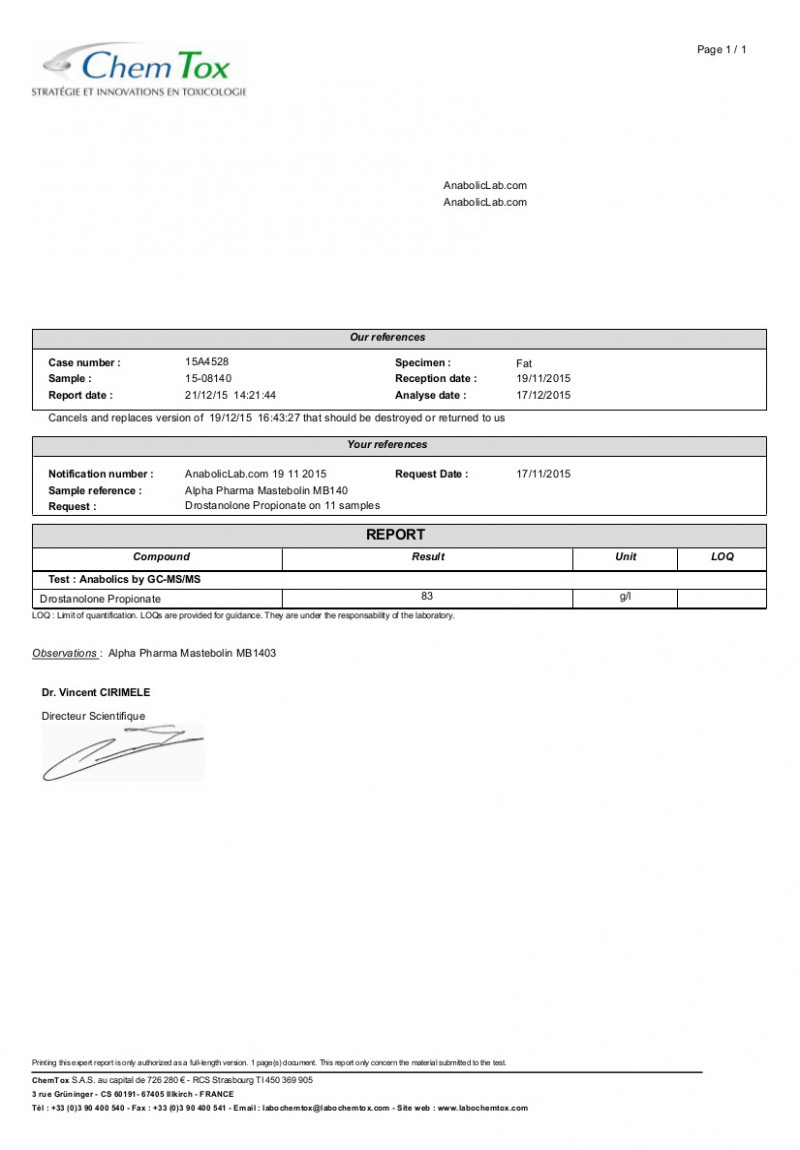 Alpha Pharma Mastebolin is presented in 1-milliliter ampules and reportedly contains 100 milligrams of drostanolone propionate per milliliter according to the label and packaging. Samples of this product were purchased from a European-based internet source between the dates of October 7, 2015 and November 7, 2015. The samples were forwarded and received by the analytical laboratory ChemTox SAS for GC-MS/MS testing on November 19, 2015. The quantitative dosage testing report was completed on December 17, 2015. The “batch number” listed on the product was MB1403.