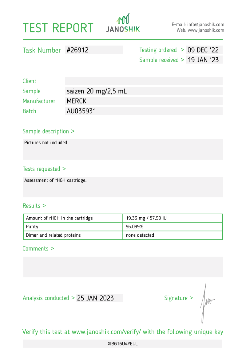 Saizen 20 MG / 2,5 ml Cartridge - Lab test