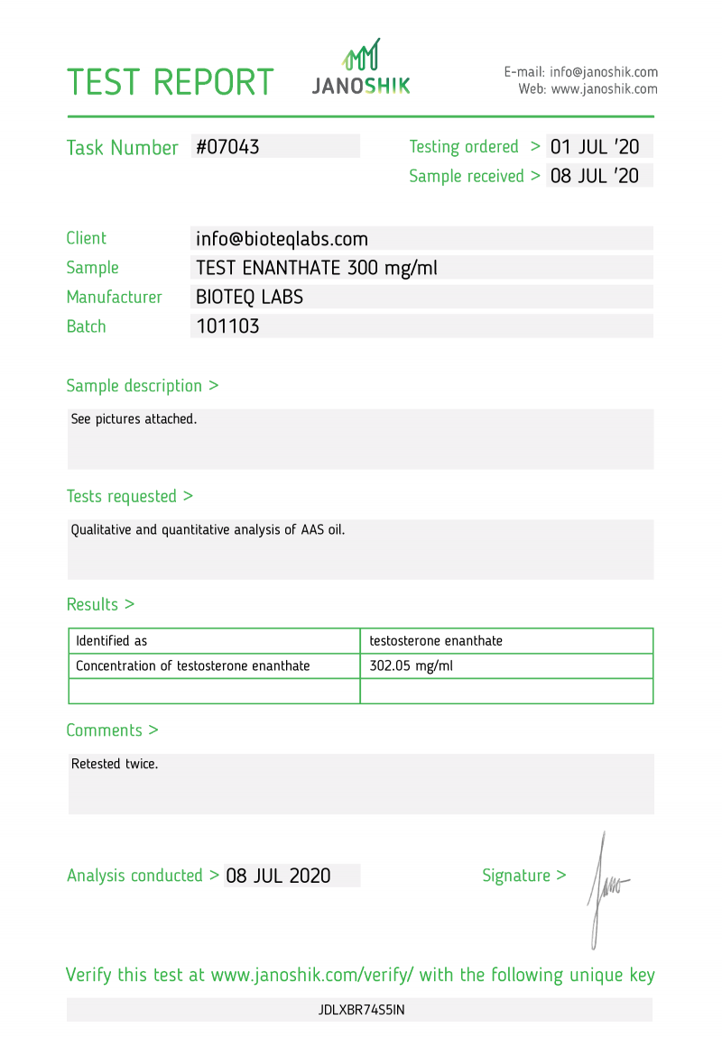 Label claim: Bioteq Labs Test Enanthate 300 has a label claim of 300 mg/ml testosterone enanthate.