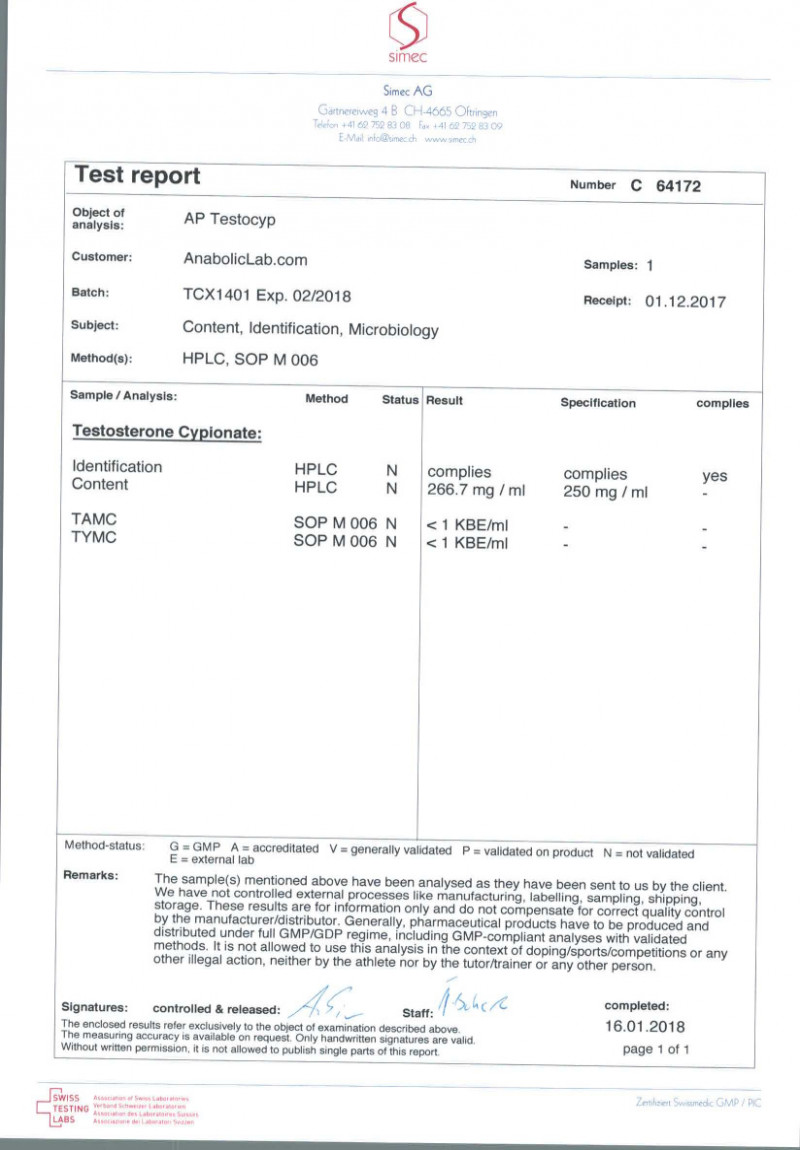 Actual content: Alpha Pharma Testocyp was determined to have an actual content of 266.7 mg/ml testosterone cypionate.