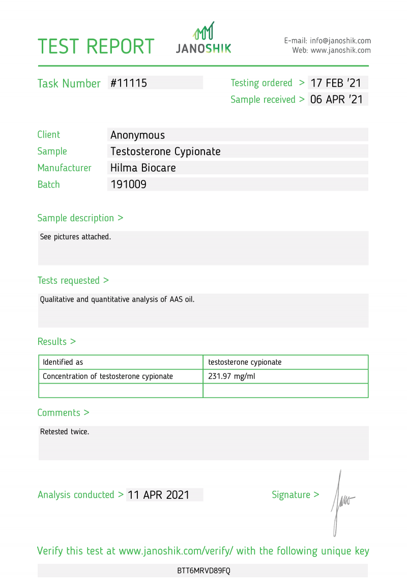 Hilma Biocare Testosterone Cypionate is presented in a 10 ml vial and reportedly contains 250 milligrams of testosterone cypionate per milliliter according to the label and packaging. The samples were forwarded and received by the analytical laboratory Janoshik for HPLC-UV testing on October 04, 2018. The quantitative dosage testing report was completed on October 12, 2018.