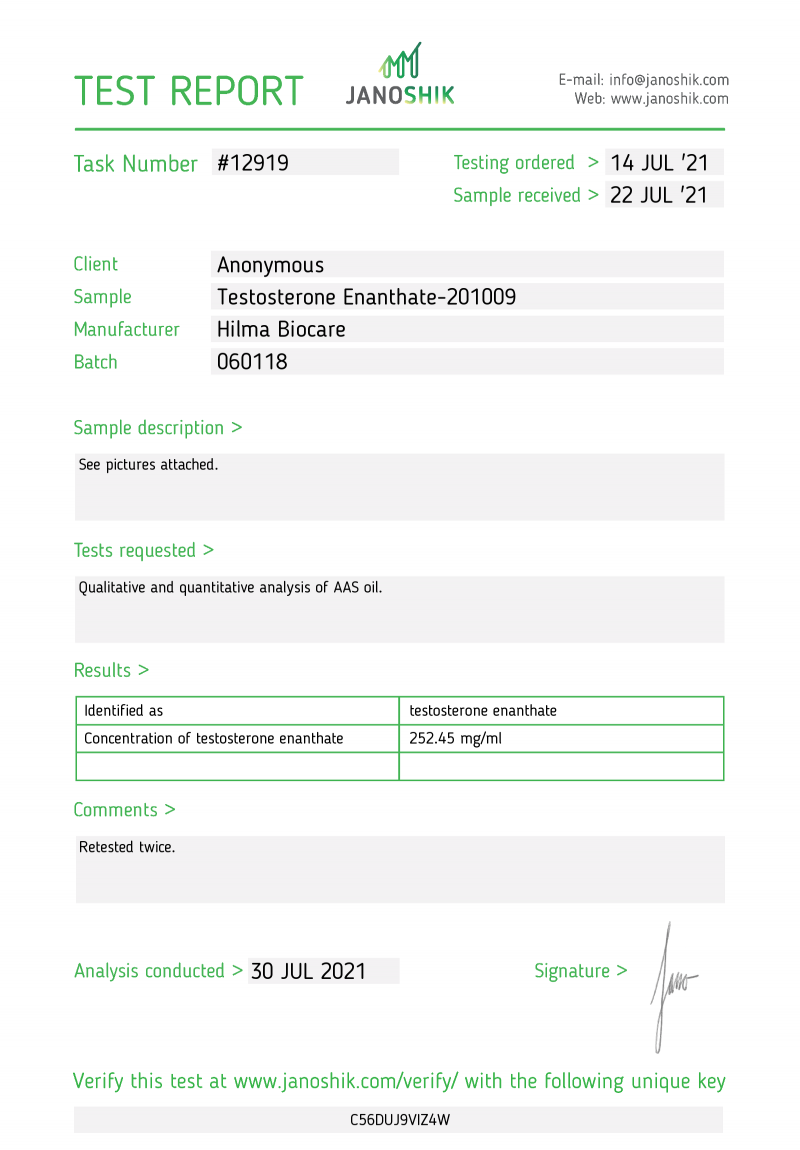 Testosterone Enanthate is presented in a 10ml vial and reportedly contains 250 milligrams of testosterone enanthate per milliliter according to the label and packaging. The samples were forwarded and received by the analytical laboratory ChemTox for HPLC-UV testing on December 12, 2017. The quantitative dosage testing report was completed on January 30, 2018.