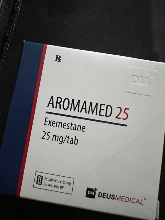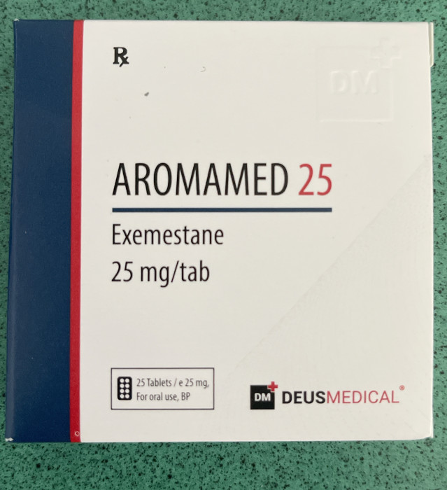 AROMAMED 25 (Exemestane) belongs to a class of drugs known as aromatase inhibitors (AIs). Anabolic steroid users can utilize AROMAMED 25 (Exemestane) for the control of almost all Estrogen-related side effects: the manifestation of gynecomastia, water retention and bloating, rising blood pressure (as a result of water retention increases from Estrogen).