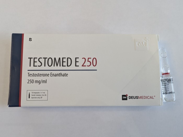 TESTOMED E 250 (Testosterone Enanthate) is one of the many esterified variants of Testosterone available. It is an injectable compound with a slow rate of release due to the larger Enanthate ester attached to the Testosterone molecule. This augments the Testosterone hormone's release rate and half-life of to that of a slower release.