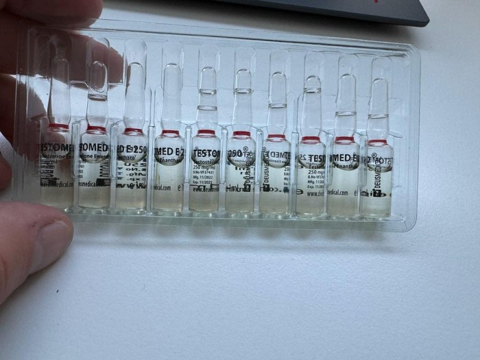 Because its half-life is 7 – 10 days, it is recommended that TESTOMED E 250 (Testosterone Enanthate) administration occur at a minimum of once per week, but ideally for optimal performance and results (and minimization of unwanted side effects due to spiking blood plasma levels), it should be administered twice per week with the weekly dosage split evenly between administrations. Let’s say, a 500 mg per week dosage of TESTOMED E 250 (Testosterone Enanthate) should be administered as 250 mg on Monday and 250 mg on Thursday every week.