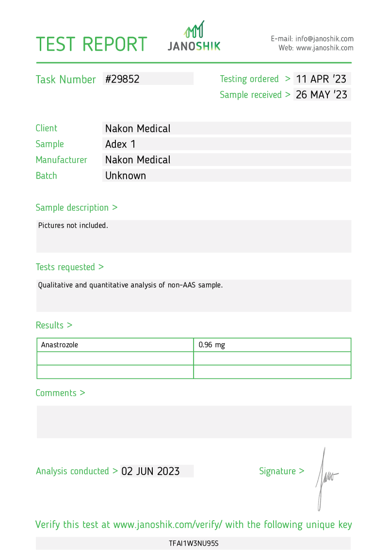 In bodybuilding, Adex 1 has found its application in order to prevent the occurrence of gynecomastia and edema.