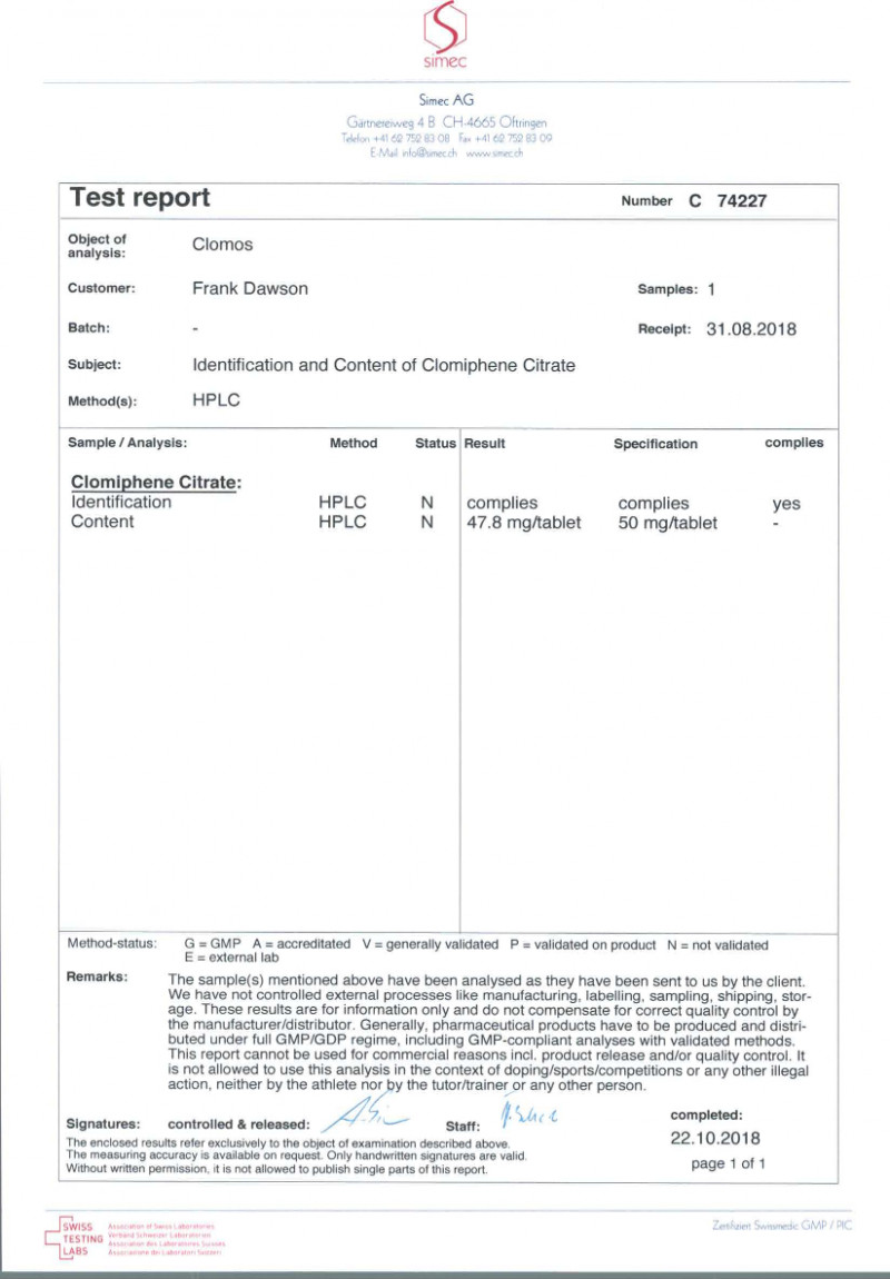 Chemically for athletes this is highly a favorable effect, since at the end of cycle Testosterone levels are higher than normal. Once the athlete stops taking medication, testosterone levels significantly decreased and its natural level must be returned. Because of this, there are considerable loss of muscle mass and volume. Studies show that when taking Clomos in the amount of 50-100 mg per day, in the evening or in the morning, after meals, in the two-week period or more natural testosterone production is back to normal.
