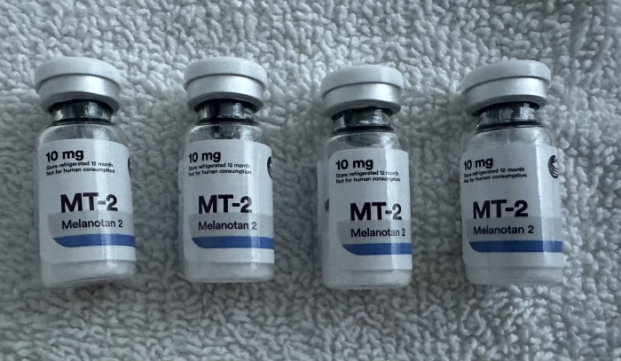 Melanotan II dosage it is recommended to start out small and build up. A typical starting dose is around .25mg and max dose reaching 1mg. Desensitization happens quick, the first administration is an opportunity to dose low to avoid Melanotan 2 side effects. Same goes for bremelanotide (PT-141) dosage unfortunately.