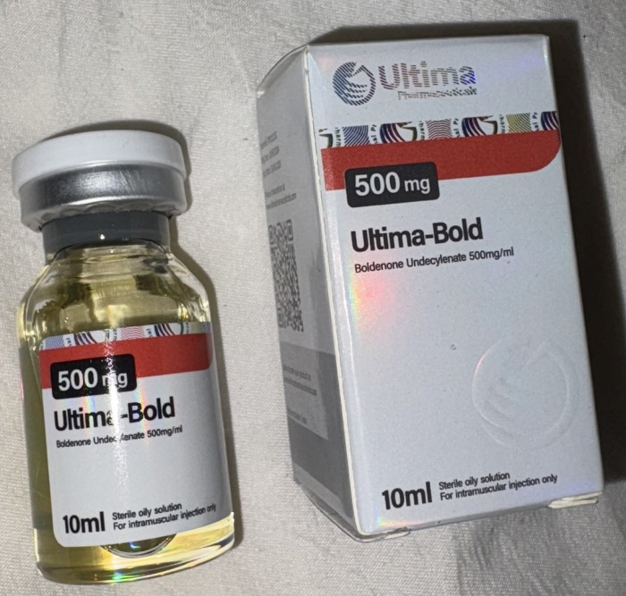 Ultima-Bold 500, from the famous Ultima Pharmaceuticals company, is available in convenient 10 ml vials. The concentration of active substance (Boldenone Undecylenate) in each vial is of 500 mg per 1 ml. This anabolic steroid has high activity and is intended for injection. Its low risk of side effects makes it possible to successfully use a steroid as solo cycle, or in combination with other sports medicine drugs.