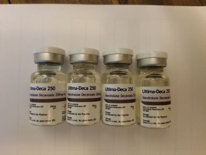 Ultima-Deca – a long-acting drug from Ultima Pharmaceuticals manufacturer. Such anabolic steroids differ by weak androgenic effect (30%) and a relatively high anabolic activity (150% of testosterone). The half-life of the active substance on average lasts for at least two weeks.