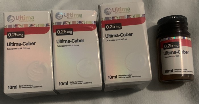 Great results with lowering prolactin levels with Ultima Pharmaceuticals Caber 10 pills x 0.25mg each. Also good for libido and keeping hormones right. Took .25mg a week, very effective.